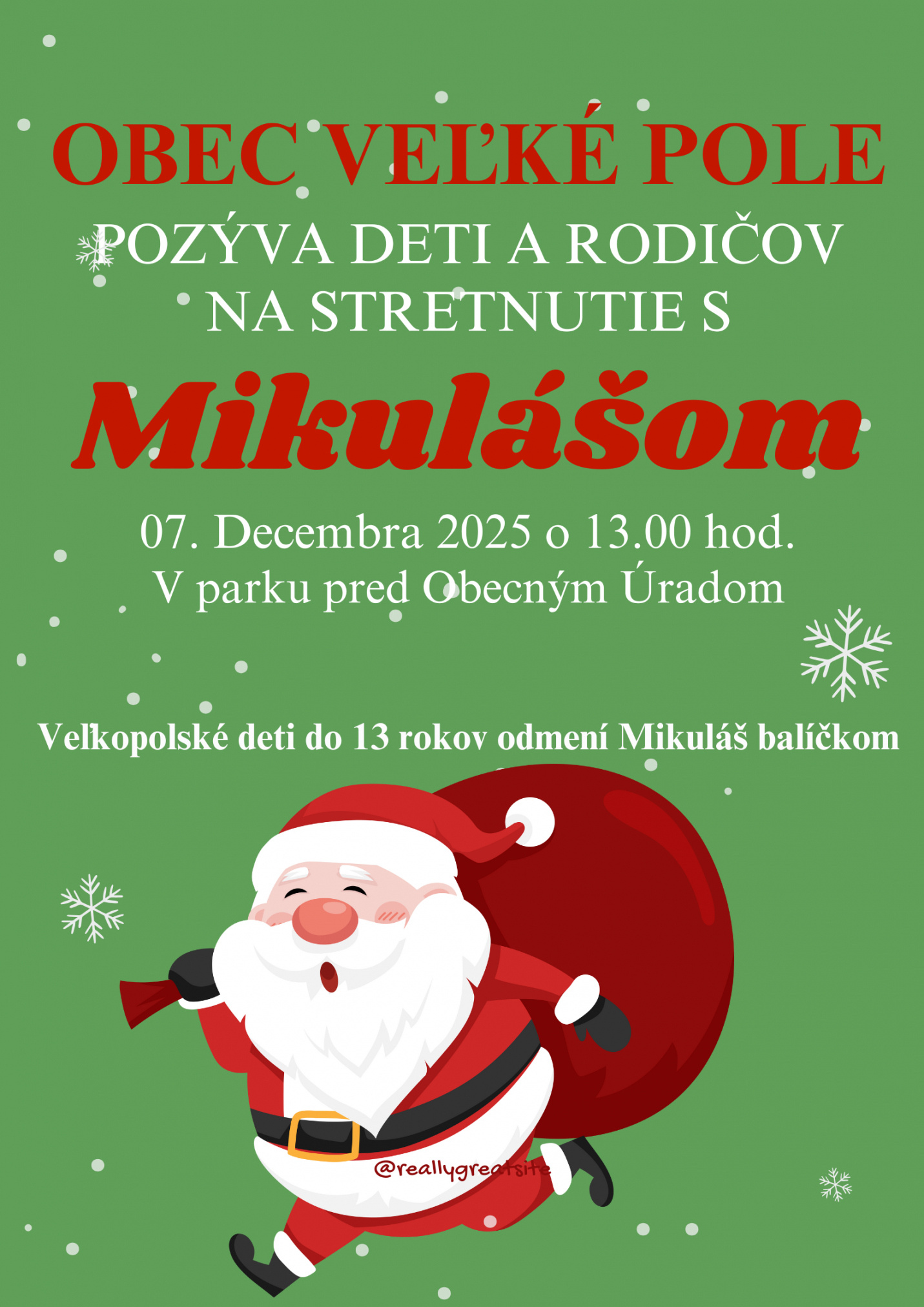 Starosta obce Veľké Pole pozýva všetky deti a rodičov na stretnutie s Mikulášom dňa 07.decembera o 13.00 hod.