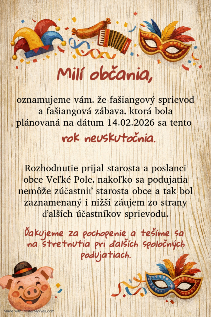 oznamujeme Vám, že fašiangový sprievod a fašiangová zábava sa tento rok neuskutočnia.